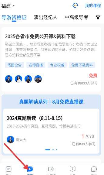 2、课程页面聚焦导游资格证,提供2025各省市免费公开课及资料,8月真题解读直播课在列标注学习人数信息丰富。