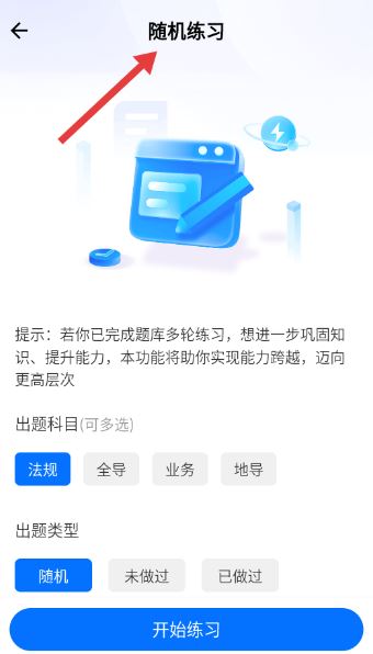 3、随机练习界面提示助力能力提升,可按需勾选法规、全导等出题科目,以及随机、未做过等出题类型灵活实用。