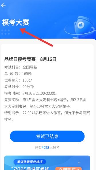4、模考大赛页面展示品牌日竞赛详情,全国导基科目考试已结束,清晰呈现题量、时长奖励等超4000人报名参与。