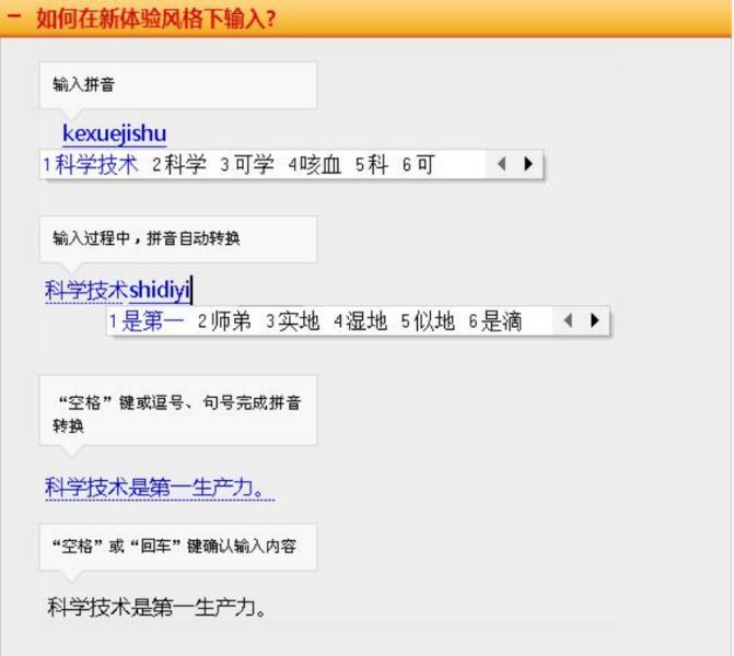 -微软拼音输入法提供了“新体验”和“简捷”两种输入风格。“新体验风格”秉承微软拼音传统设计,采用嵌入式输入界面和自动拼音转换;“简捷风格”则为微软拼音输入法2010全新设计,采用光标跟随输入界面和手动拼音转换。无论您习惯于哪种打字方式,您都可以在微软拼音输入法2010中找到适合您的输入风格。