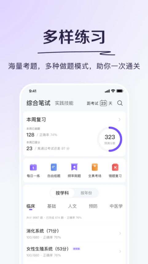 1、打开丁香医考app后选择学科分类如临床医学或预防医学,进入对应题库开始练习题目,支持按章节或题型筛选。