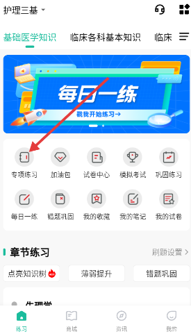 1、打开app,进入练习页面,可点击【专项练习】功能,选择科目开始练习。