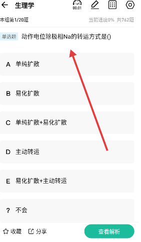 3、在【生理学】答题页,选择选项进行题目作答,之后点击【查看解析】。