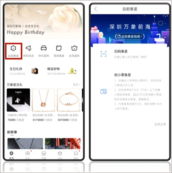 消费后请向店铺索取消费小票,打开“一点万象”APP ,进入首页点击[自助集星]。