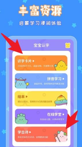 1、拥有丰富的学习资源,分类明确,包含的内容丰富,让儿童轻松进行启蒙学习;