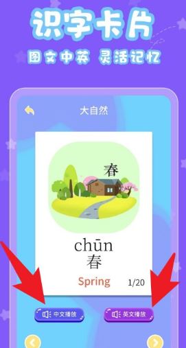 1、提供了识字卡片,自行按照分类进行选择,并提供了汉字中英文读音;