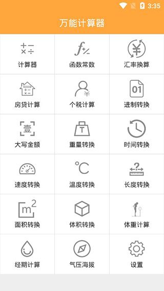万能计算器app是由保定尚卡网络科技有限公司研发的一款功能丰富的计算器软件,有着十分清新的界面,没有丝毫广告,拥有基本的计算器功能,可执行加、减、乘、除等基本运算,不过比自带的计算器更加好用,还拥有函数常数这类复杂的运算功能,既适合平常用户使用,还能满足学生党使用所需。除此之外,万能计算器还包含汇率转换、房贷计算、个税计算、进制转换、大写金额、经期计算等丰富的功能,小到各种单位的转换,大到房贷计算,功能非常全面,生活中遇到需要计算的场景,有它就够了。