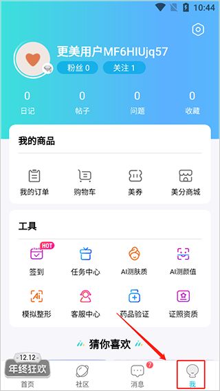 1、首先打开更美app,点击底端我的。