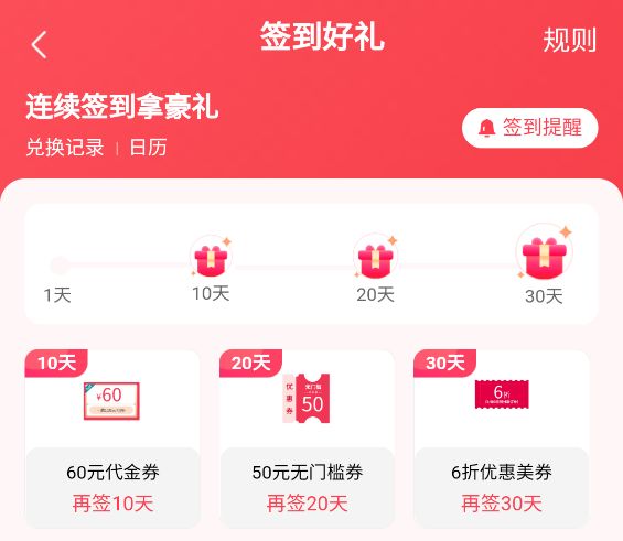 2、连续签到30天即可获得三张美券,如下图所示。