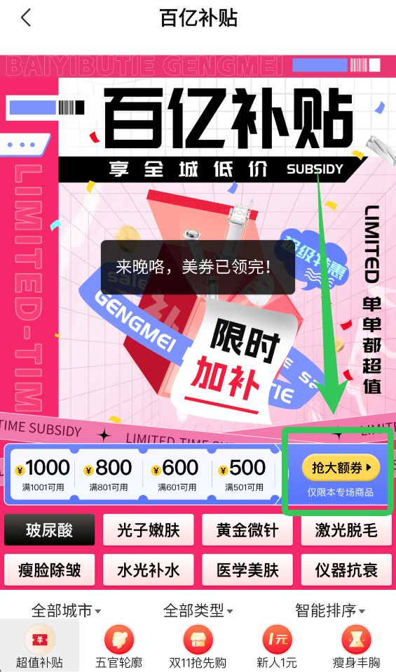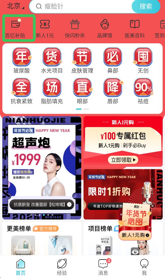 3、【首页】点击上方【百亿补贴】,可抢大额美券。