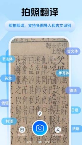 通过拍照输入需要翻译的内容,一键识别转换为中文输出;支持多图片导入后同时翻译;支持古文体、书法体、手写体文字识别翻译。