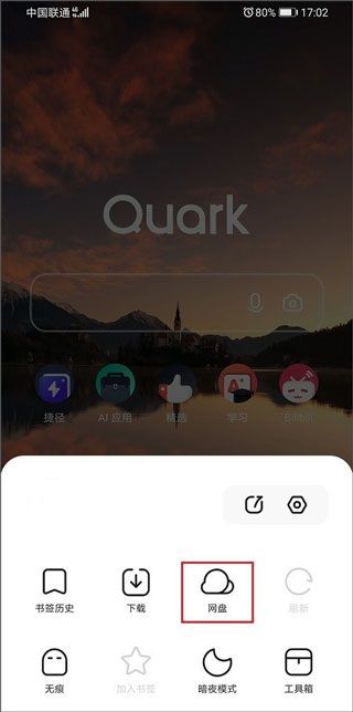 1、打开夸克浏览器后,点击菜单图标,进入夸克网盘。