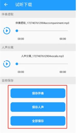 5、提取完成后可以选择单独保存生成的伴奏或人声音频文件,也可以全部保存。