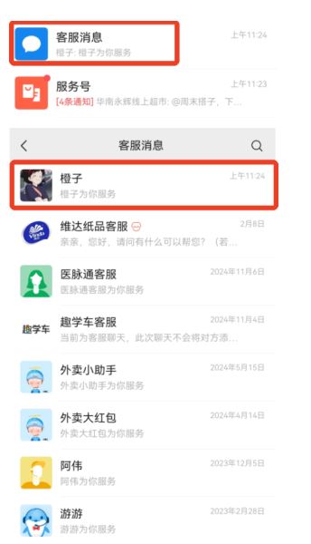 4、如果之后想再次找客服可以按照上面的方法,或者直接来到微信聊天列表找到【客服消息】点击进入,就能看到我们之前找过的客服了。