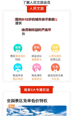 人民文旅是人民日报大力推荐的面向3-12岁的城市亲子家庭会员制文旅服务平台。里面不仅有景区免单低价特权,还有各种精选亲子活动等你来参加。