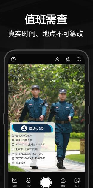 自定义打卡水印相机手机端使用的相机软件,这款软件集合了经纬度水印、时间水印、地点水印、天气水印等多套模板,真实还原多种工作和生活场景,满足不同用户对水印样式的需求等,欢迎下载。