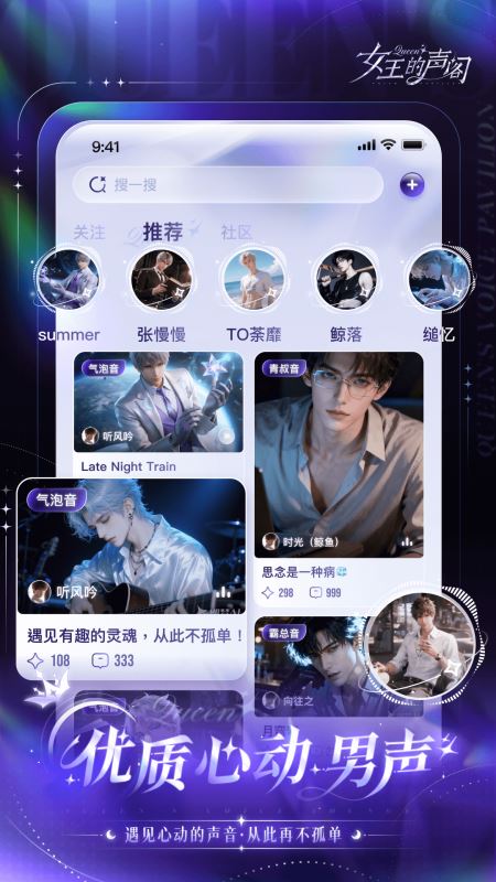 汇集了海量优质男声:气泡音、青叔音、霸总音、奶狗音,超多有颜有趣的小哥哥,即可连麦,邂逅心动的他~