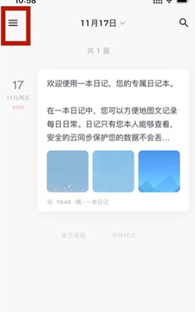 1、打开一本日记官方版app,进入首页点击右上方的“三杆”图标按钮;