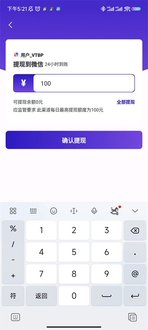 注意:最高提现100元,每天只能提现一次,三个工作日到账哦。