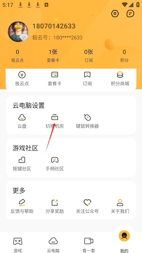2、 在“我的”页面中,找到“切换机房”功能,点击进入。