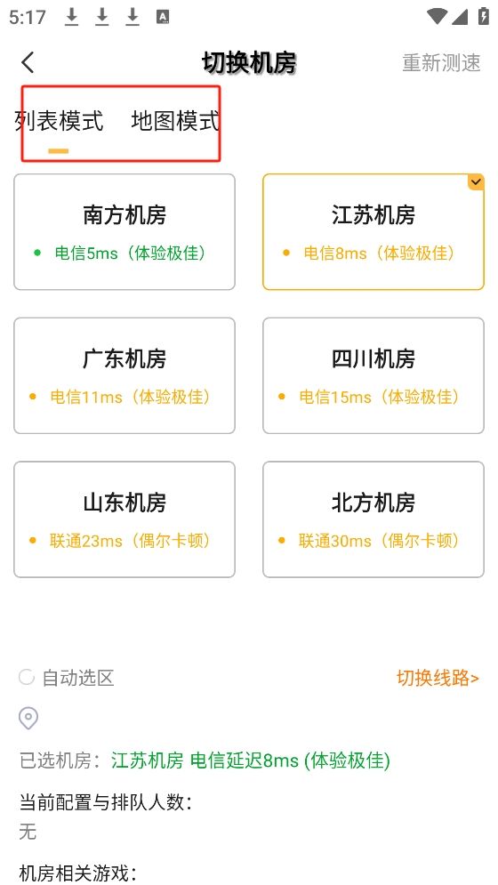 3、 此时会显示可选择的机房列表,如南方机房、广东机房等,根据自己的地理位置或网络情况,选择合适的机房即可。
