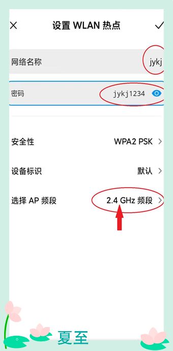 设置个人热点。网络名称设置为jykj这四个字母,密码输入:jykj1234。AP频段选择2.4Ghz或5Ghz均可。