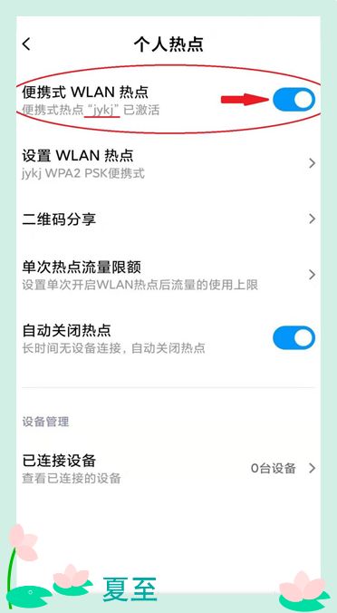 点勾选,回到上一个设置界面。打开便携式WLAN热点(这个是小米手机的界面,其他手机也许有不同)。确定热点已经激活。