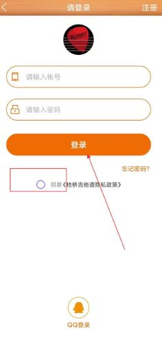 1、进入枯桥吉他谱app,勾选同意相关政策,在对应输入框填写账号和密码,点击登录按钮完成账号登录。