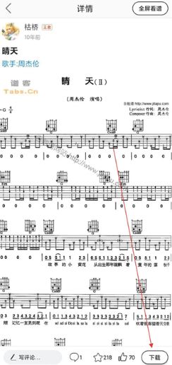 4、在乐谱详情页查看谱子的具体内容,可进行点赞等互动操作,确认需要该乐谱后,点击页面中的下载按钮,即可将该吉他谱下载保存至设备。