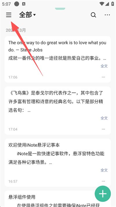 1、在笔记列表页,点击左上角三条横线图标,打开侧边栏菜单;