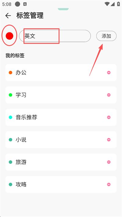 3、在标签管理页,选择一个颜色圆点(如红色),在输入框中填写标签名称(如 “英文”),点击右侧添加按钮,完成新标签创建;