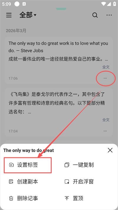 4、回到笔记列表页,找到目标笔记,点击其右下角的三个点图标,在弹出的菜单中,选择设置标签选项;