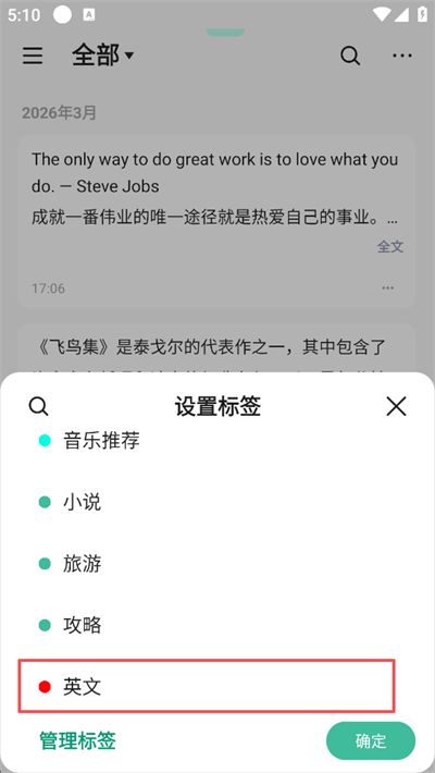 5、在设置标签弹窗中,勾选已创建的标签(如 “英文”),点击确定,完成标签绑定;