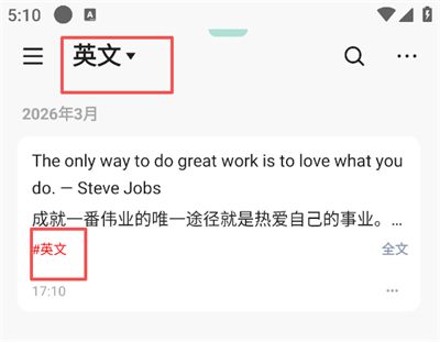 6、回到笔记列表页,点击顶部的分类下拉框(原 "全部"),选择已创建的标签(如 "英文"),即可筛选出所有带有该标签的笔记;