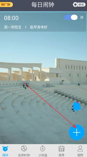 1、打开每日闹钟app进入闹钟主界面,在界面右下角有一个蓝色的加号按钮,点击这个按钮就可以进入新建闹钟的设置界面,开始设置新的闹钟时间和相关参数。