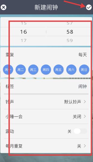 2、进入新建闹钟界面后,你可以设置闹钟的时间包括小时和分钟,同时还可以设置闹钟的重复周期,设置完成后点击界面右上角的对勾按钮,保存新设置的闹钟。