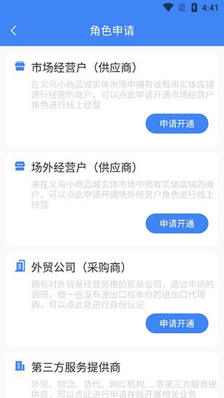 大家在首页找到角色申请功能,进去之后,可根据自己的实际情况进行选择,例如市场经营户,选择完成后,点击申请开通。
