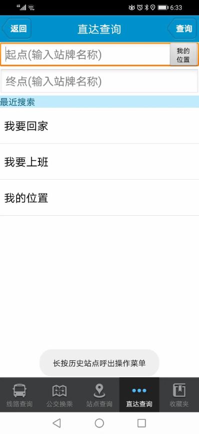 6、在公交换乘界面,市民可选择出发点与目的地,查询车辆转乘信息。