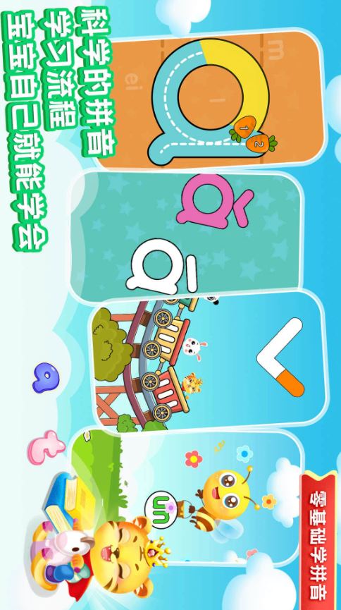 融合了幼儿园拼音,幼小衔接,小学,前拼音教学、汉语拼音字母发音、字母书写,声调学习。拼音发音点读,汉字拼音,以可爱的学习场景和趣味儿童游戏,让小朋友在轻松的氛围下,练习拼音,学习的拼音发音与拼读。