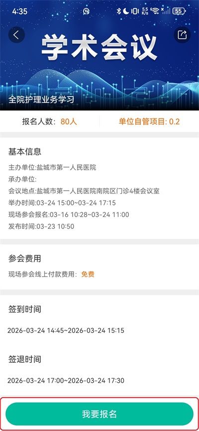 3、在会议页面中点击"我要报名",系统自动获取报名信息,生成的申请表会发送给会议的管理员,管理员在后台发布会议时选定。
