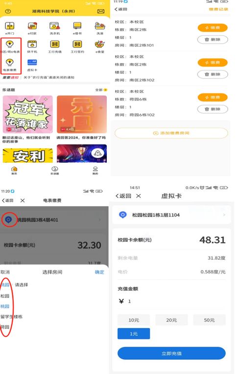 1、南区、荷园6栋点击南区/荷6电表,其它宿舍区域点击电表缴费,相应区域选择对应需缴费房间进行电表缴费。
