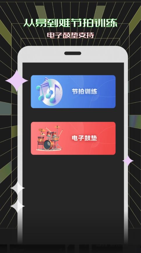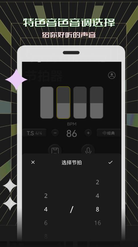 提供爵士鼓、敲击贝斯、电子合成器、中英文语音等11种音色,满足不同乐器练习(如钢琴、吉他、古筝)及跑步、健身等场景的节奏需求。音色库持续更新,用户可自由切换以匹配练习风格。
