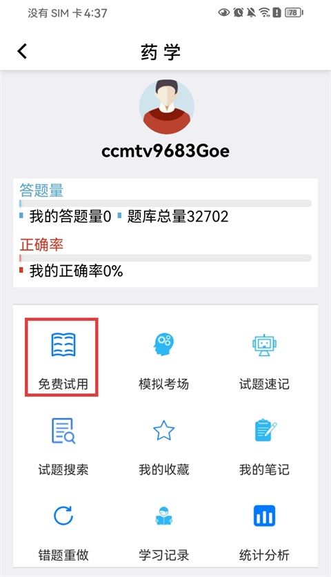 5、点击【免费试用】按钮,开始免费使用题库进行练习。