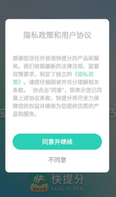 1、我们安装好快提分app后,先同意其安全隐私协议;