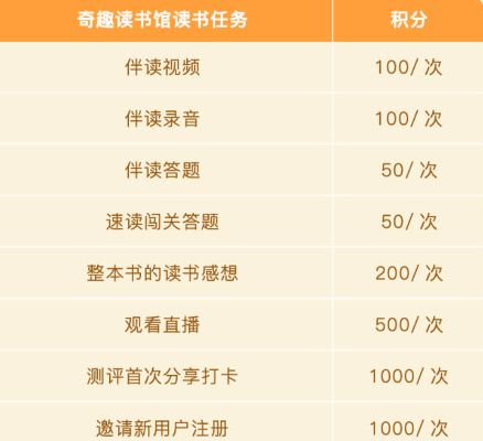 用户可通过完成线上读书任务、上课课程等相关内容,参与活动以及积极分享等即可获得积分,积分可在应用商城中进行兑换书籍、玩具、教具等。下表是各种读书任务在完成后所能获得的积分