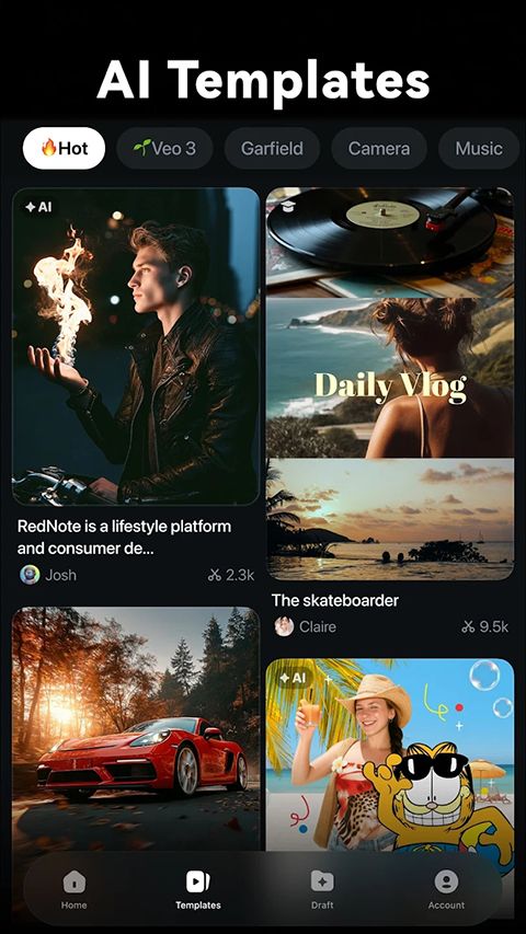 用户点击下方模版,即可进入模版视频页面,里面有许多好看好玩的模版,玩家可以尽情的使用自己喜欢的模版来创建视频。
