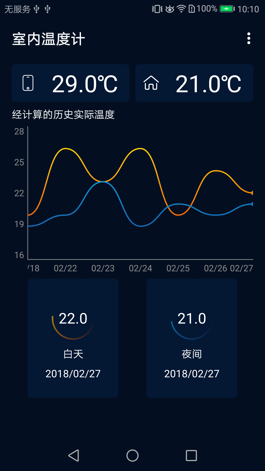 室内温度计app是一款能够智能侦测室内温度的app,软件通过感知设备状来计算环境温度,设备处于实际测量环境中的时间越久,计算结果越准确。历史温度一般会在app安装后一到两天内,通过绘制线型图呈现,安装后软件开始收集温度数据两小时后启动室内温度智能分析,即使设备长期带在身上也可以计算出一个相对准确的环境温度。室内温度计不仅可以侦测温度还支持侦测室内外湿度,软件可以实时侦测用户周围的温度。