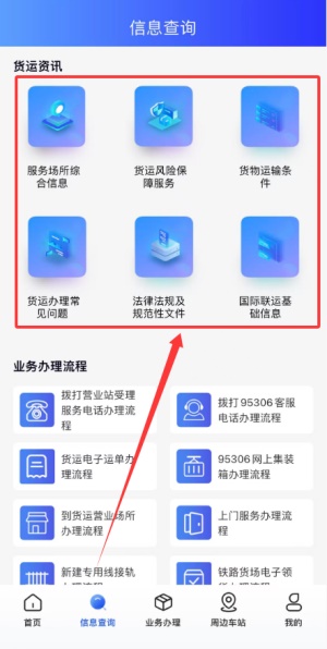 4、信息查询板块整合了服务场所综合信息货运风险保障政策解读货物运输条件说明及常见业务办理问题解答。