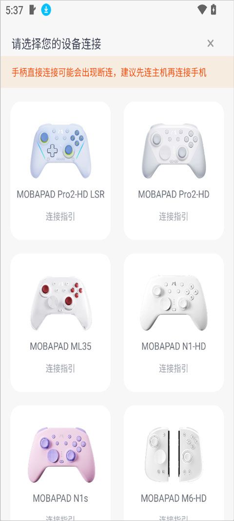 在设备管理界面,选择对应的魔派手柄型号(如MOBAPAD M6-HD)进行连接,支持蓝牙及USB手柄。