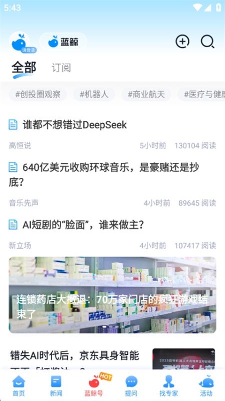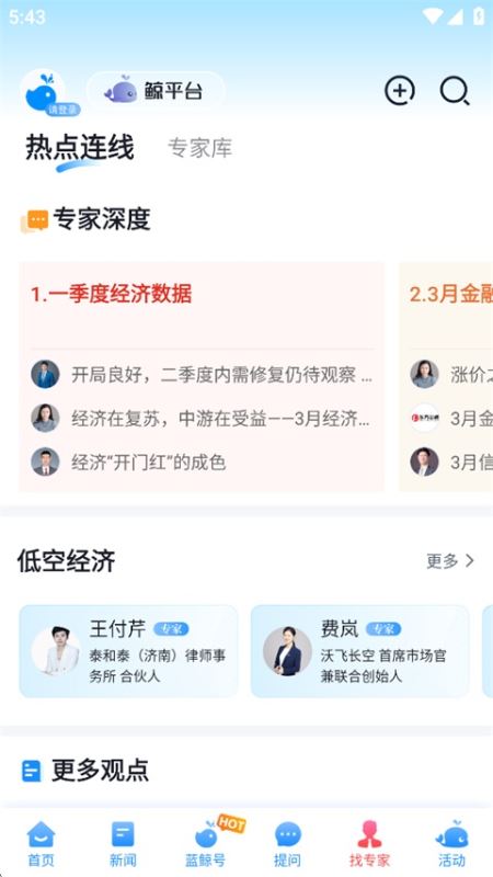 蓝鲸财经app是一款新闻资讯服务报道软件,由国内多名资深媒体主编担纲,力推独家富有建设性的深度报道,并且每天为您推送最专业最新的财经新闻资讯。该软件涵盖了TMT、银行、基金、房产、汽车、教育等多种行业的最新报道,针对热点事件推荐专家、每日精选话题讨论、功能十分强大。用户可以在软件中可以选择感兴趣的内容,第一时间获取行业内的信息,深度解剖信息内容。有需要的朋友可以在本站下载使用哟!
